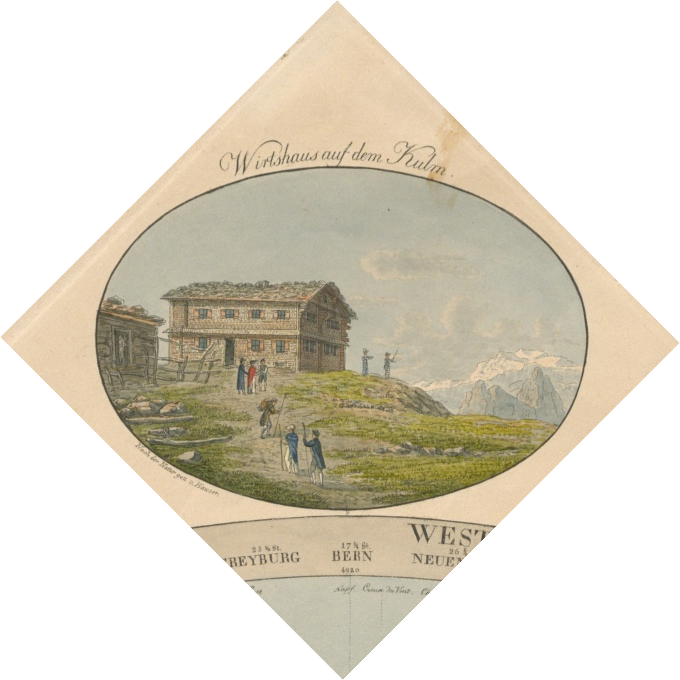 Horizontalpanoramen wurden meist von freistehenden, hohen Standorten aus aufgenommen, in diesem Falle auf Rigi Kulm,1797 m ü. M, auf dem Anzeigepunkt der Himmelsrichtungen. Die messbaren Punkte des natürlichen Horizonts bildeten einen äusseren Rand der sichtbaren Welt und boten den Alpenbegeisterten eine neuartige Fernsicht von oben.