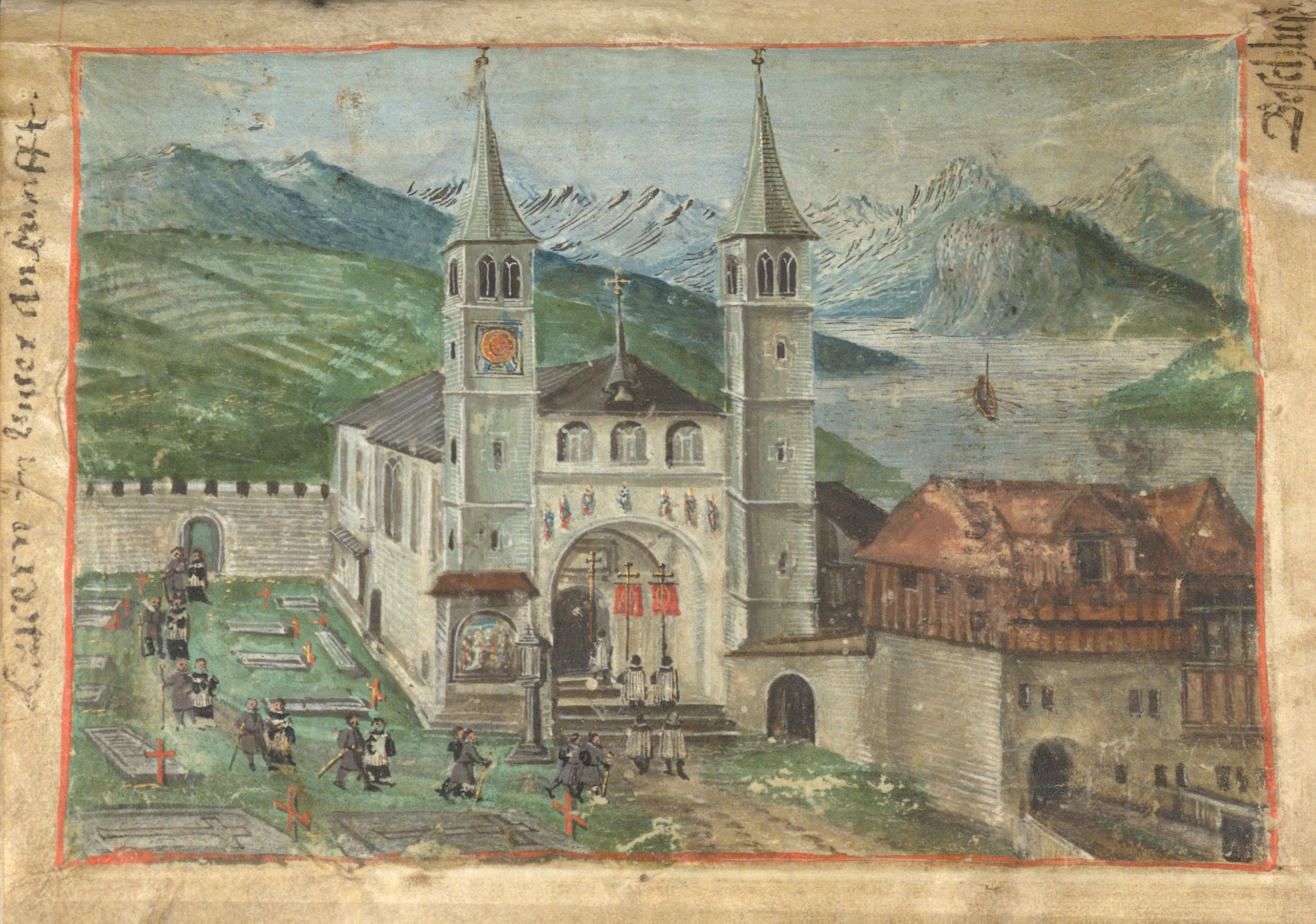 Im Jahr 1583 unternahm der Luzerner Patrizier Rudolf Pfyffer von Altishofen (1545–1630) eine Pilgerfahrt nach Jerusalem. Etwa acht Jahre nach seiner Rückkehr entstand dieser prächtig inszenierte Reisebericht. Schon das Material Pergament – statt des längst üblichen Papiers – ist ungewöhnlich kostbar. Die Schrift (teils in Goldtinte) dürfte von einem professionellen Schreiber stammen, und die zahlreichen Illustrationen wurden in der renommierten Luzerner Werkstatt von Franz Fallenter angefertigt. Inhaltlich bietet Pfyffer Beschreibungen von Kirchen und Reliquien, auch einige Wundergeschichten. Über die Reise selbst erfährt man dagegen aus anderen Quellen mehr.*