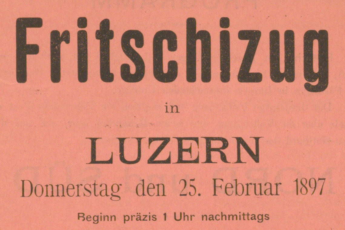 Am Schmutzigen Donnerstag, dem 25. Februar 1897, versammelten sich in Luzern rund 1500 Fasnächtlerinnen und Fasnächtler mit 50 Wagen und 8 Musikkapellen zum grossen Fritschizug. Der ortsansässige Fotograf Caspar Hirsbrunner (1865-1928) dokumentierte dieses Ereignis in 29 Bildtafeln.