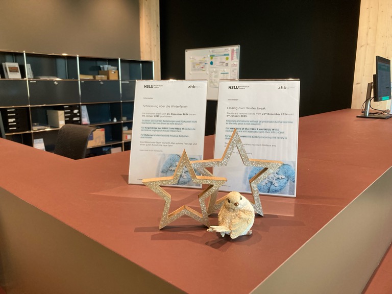 Die Bibliothek HSLU – Informatik und Wirtschaft bleibt über die Feiertage vom 24. Dezember bis am 04. Januar geschlossen.
