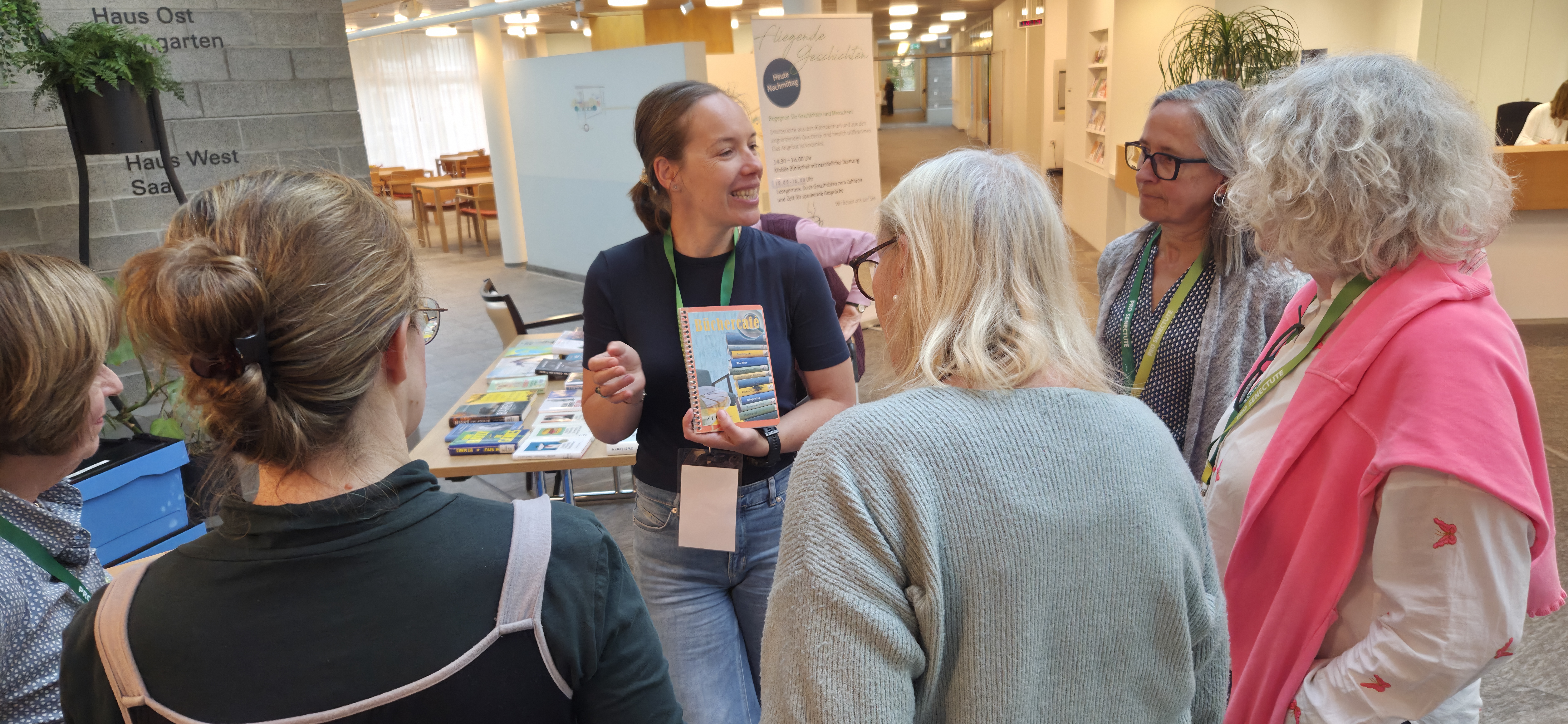 Im Foyer des Alterszentrums herrscht geschäftiges Treiben. Das fünfköpfige Team der mobilen Bibliothek richtet mit geübten Handgriffen die Büchertische her und präsentiert neue Lektüretipps. Pünktlich um 14.30 Uhr erscheinen die ersten Bewohnenden und stöbern interessiert in den Büchern. Vroni und Lisbeth beraten sie, stellen Neuerscheinungen vor oder geben persönliche Empfehlungen ab.